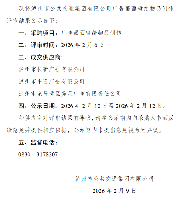 瀘州市公共交通集團(tuán)有限公司廣告畫(huà)面噴繪物品制作評(píng)審結(jié)果公示